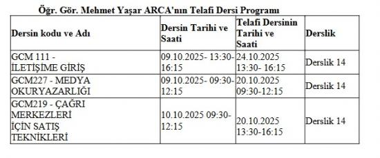 Öğr. Gör. Mehmet Yaşar ARCA'nın Ders Telafi Programı