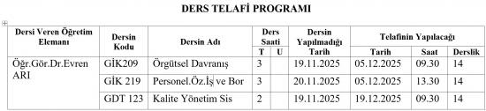 - Öğr. Gör. Dr. Evren ARI'nın Ders Telafi Programı