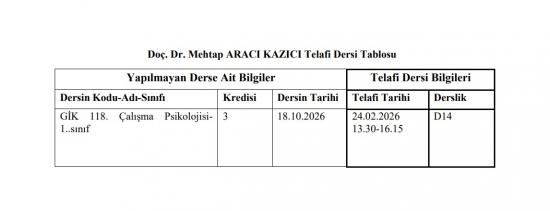 Doç. Dr. Mehtap ARACI KAZICI'nın Ders Telafi Programı