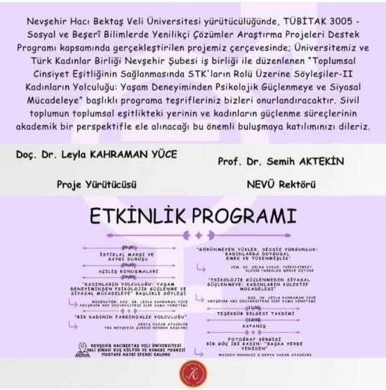 Gülşehir Sosyal Bilimler Meslek Yüksekokulu öğretim üyesi Doç. Dr. Mehtap Aracı Kazıcı'nın araştırmacı olarak görev aldığı, Kamu Yönetimi Bölümü öğretim üyesi Doç. Dr. Leyla Kahraman Yüce yürütücülüğünde devam eden; TÜBİTAK-ARDEB 3005 Sosyal ve Beşerî Bilimlerde Yenilikçi Çözümler Araştırma Projeleri Destekleme Programı kapsamında destek almaya hak kazanan proje, sivil toplumun gücünü akademik verilerle birleştiriyor. 26 Mart 2026 tarihinde gerçekleştirilecek olan